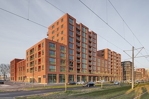 Het eerder dit jaar opgeleverde woonblok KOER aan de Laan op Zuid in Rotterdam is ontworpen door V8 Architects, Studio Architectuur Maken en LOLA Landscape Architects in opdracht van VORM.