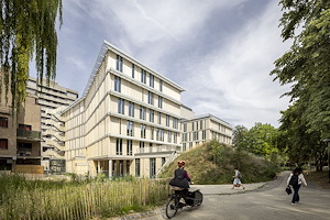 In dit centrum voor oncologie en hematologie is alle zorg op deze gebieden van het universitair ziekenhuis Saint-Luc op één locatie ondergebracht. Het H-vormige gebouw kenmerkt zich door een houten lamellengevel, afgewisseld met glas.