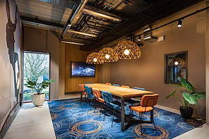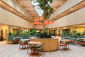 In de lounge van NBC Congrescentrum Nieuwegein zorgt een warm HeartFelt® plafond voor comfort, akoestiek en een uitnodigende uitstraling. |