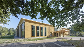 Circulair en biobased vernieuwd gemeentehuis Voorst met duurzame aluminium gevels en warm, natuurlijk materiaalgebruik. |