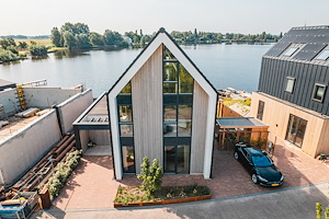Voor deze villa aan het water in Spaarndam is gebruik gemaakt van Fraké Noir gevelbekleding behandeld met een woodsealer |