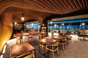 A flowing timber interior transforms this café into a warm, immersive space shaped by rhythm, texture, and light. |