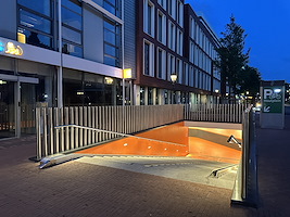RVS leuningen met geïntegreerde LED-verlichting zorgen voor een veilige en heldere entree aan het Houtplein. |